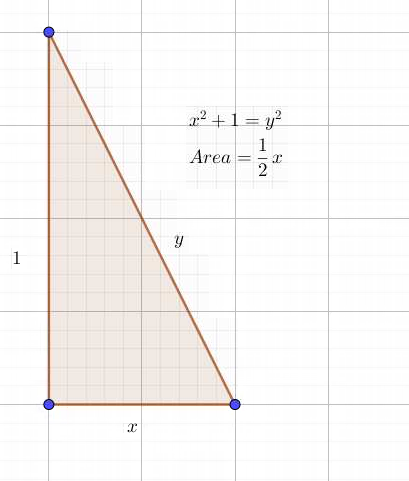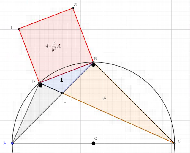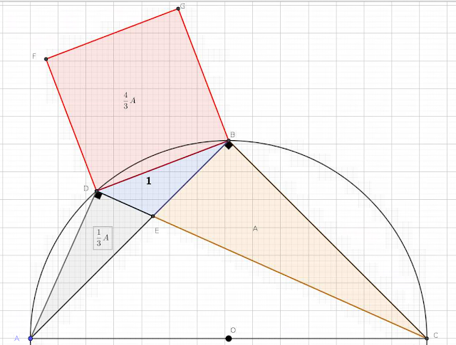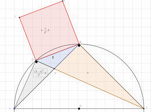 In either case we already know something else interesting $ x^2 + 1 = 3x \rightarrow y^2 = 3x $ and we can remove y^2 from our previous diagram to get $ [BDFG] = \dfrac{4x}{3x} A = \dfrac{4}{3} A $
