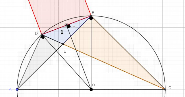 Let’s start with original equality now: [BCE] + [ADE] = [BDFG] . We already know formulas for two of those polygons and are just missing the third. However, BCE and ADE are similar and we actually know enough to find their scale factor. We already found $ CE = y \cdot r \sqrt{2} $. On the other side AE = AB - BE which becomes $ AE = r \sqrt{2} - x r \sqrt{2} = (1-x) r\sqrt{2} $. Combining we find the second ratio $ \dfrac{AE}{CE} = \dfrac{1-x}{y} $ In terms of area then