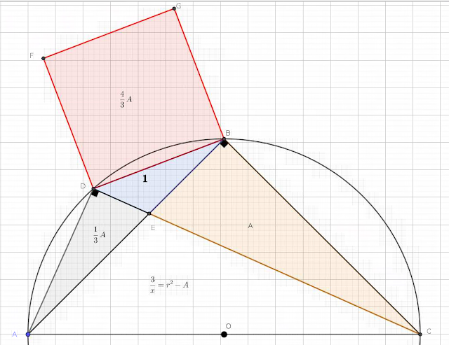 We can then also note since ABC is a right isosceles triangle: $ [\triangle{ABC}] = r^2 $ and arrive at our second basic equation from [ABC] = [CAE] + [BCE] \(r^2 = \dfrac{3}{x} + A \)
